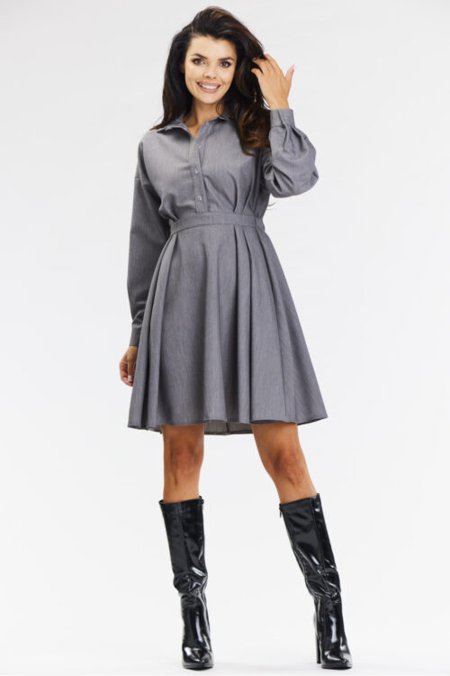 Elegant, shirt dress flared, in gray. Add elegance to your closet with our gray shirt dress, perfect for formal and business occasions. The flared hem, knee-length and long sleeves finished with cuffs emphasize femininity and style. A stand-up collar and…