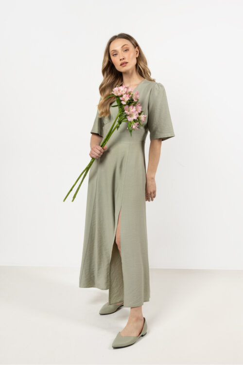 Elegant, fitted midi dress with long sleeves and V neckline. Introduce elegance into your closet with this green midi dress, perfect for business meetings and elegant celebrations. Fitted cut with a V neckline and stand-up collar emphasizes femininity, elongates the…