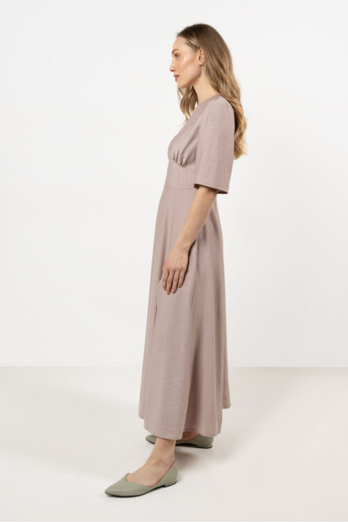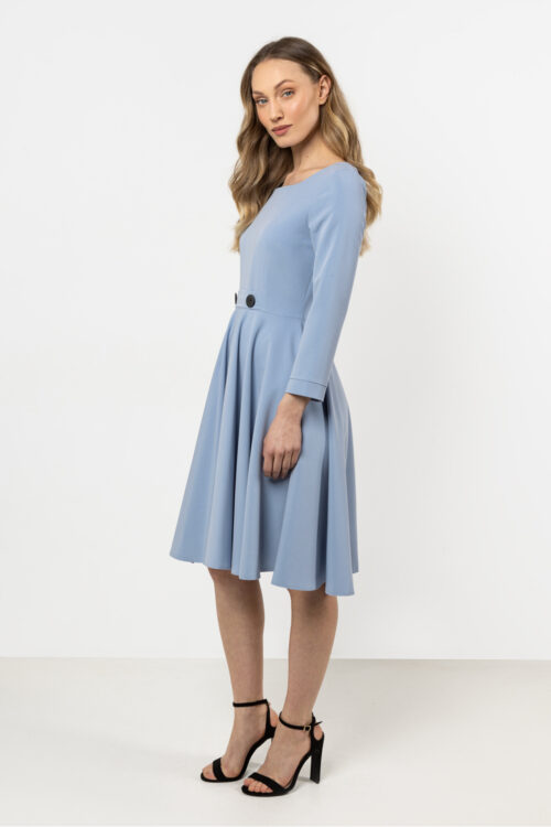 Elegance and freedom, this dress is the perfect choice for special occasions. The flared silhouette beautifully accentuates the figure and ensures comfort while wearing. The boat neckline with decorative pleats adds a subtle charm, while the 3/4 sleeves complete the…