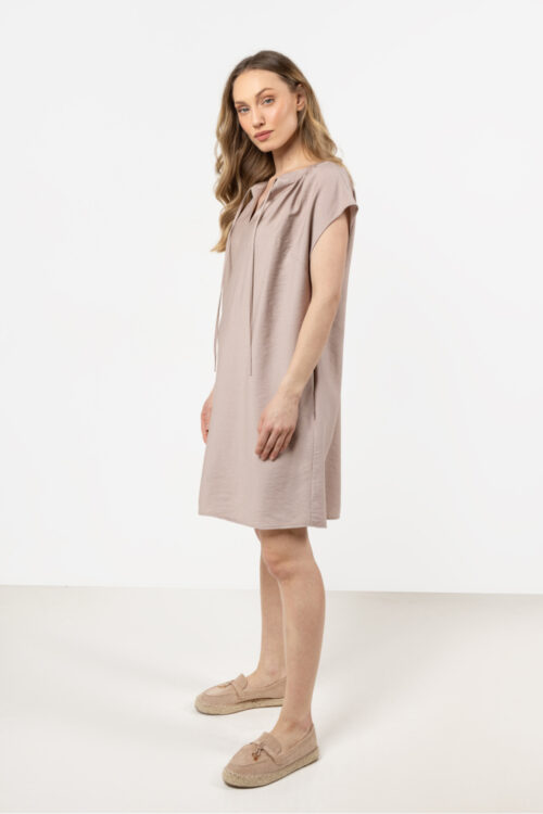 Light and elegant, this dress is a combination of comfort and style. The loose fit ensures freedom of movement, while the subtle gathering at the neckline adds a feminine touch. The collar with a tie allows for neckline adjustment, and…