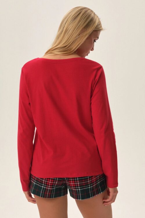 Women’s pajamas made of soft, smooth cotton, lined with insulation on the inside. The blouse has long sleeves and a round neckline, decorated with a pocket and a Christmas-themed element. The set includes shorts. The bottom of the blouse and…