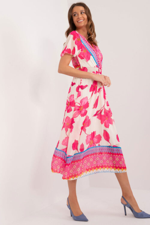 This dress is the perfect choice for everyday styling, combining comfort with distinctive style. Made of fabric decorated with a colorful print, it adds freshness and energy to any ensemble. Short sleeves provide freedom of movement, and the midi length…