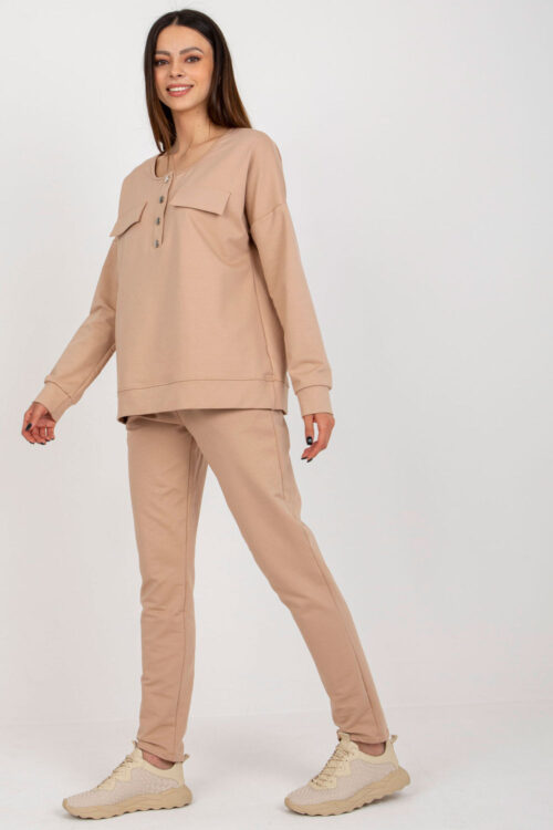 Casual women’s set consisting of a blouse and pants. Sweatshirt of a looser cut with long sleeves and a heart-shaped neckline. Long pants with wider legs with an elastic band and binding at the waist. Cotton 85 % Spandex 15…