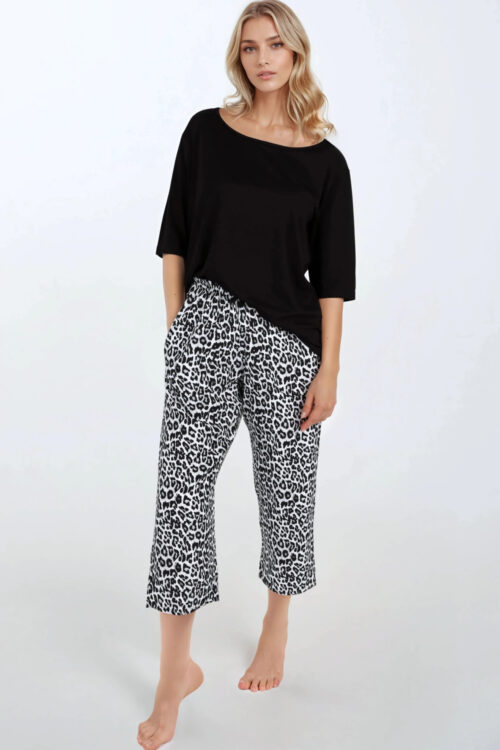 Women’s 2-piece pajama designed with comfort and delicate, feminine style in mind. The blouse with 3/4 sleeves and a round neckline provides freedom of movement, and the decorative finish of the sleeves with lace adds subtle elegance. The 7/8 length…