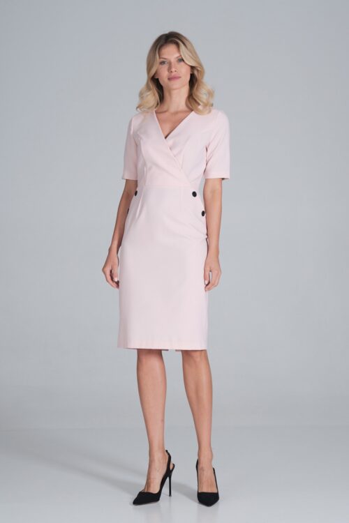 Midi dress with a nice neckline and short sleeves. Dress in powder pink. Classic and elegant. Made of thicker, stretchy material. Made in Poland. Spandex 5 % Polyester 95 % Size Lenght Hips Chest Waist L 97 cm 96 cm…