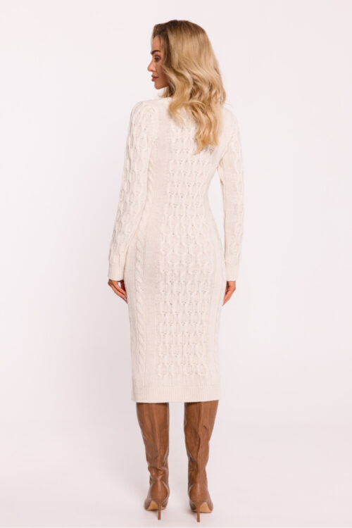 A sweater dress with a fitted cut, made of yarn with a variegated weave that gives it a unique texture and softness. It features long sleeves and a V-neckline, emphasizing the neck and adding elegance. The midi length provides comfort…