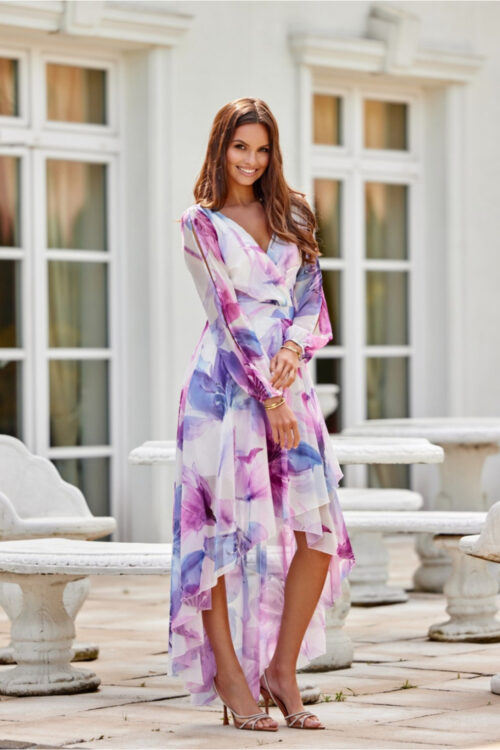 Asymmetric maxi dress. Flared bottom, top with a wrap neckline and amazing long puffy sleeves with decorative slits. Sleeves finished with an elastic band. The dress narrowed at the waist will perfectly emphasize the waist area. Fastened at the back…
