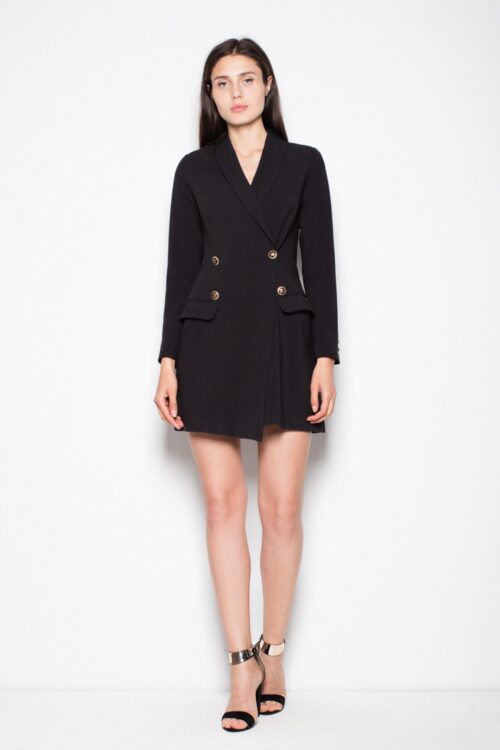 Elegant jacket dress fastened with decorative buttons that also appear at the sleeves. Dress available in classic colors. Can also be worn as a jacket. Spandex 4 % Polyester 66 % Viscose 30 % Size Lenght Hips Chest Waist L…