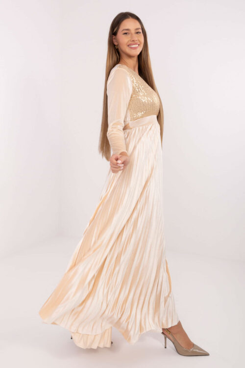 Dazzling, long evening dress without straps, created for special occasions. The top of the dress is decorated with a subtle belt of shimmering sequins, which beautifully emphasize the waist and add elegance to the outfit. The model has a striking…