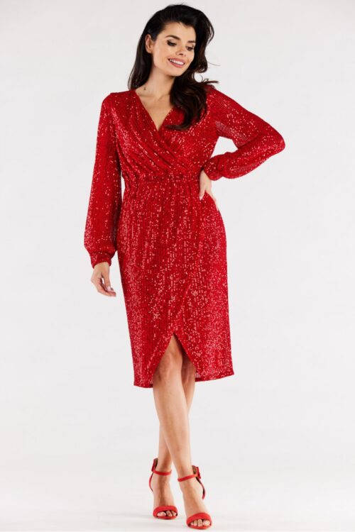 Sequined envelope dress with wider sleeves and a ruffle at the cuff. Wide elastic at the waist for a snug fit. The dress is sewn with elastic lining. The dress is made in Poland. Spandex 5 % Polyester 95 %…