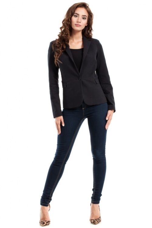 Simple and elegant jacket with one button in the middle. A deep, pointed collar at the neckline. Decorative patches imitating pockets on the sides. Perfect for transitional seasons. Cotton lined jacket suitable for business meetings and family events in autumn…