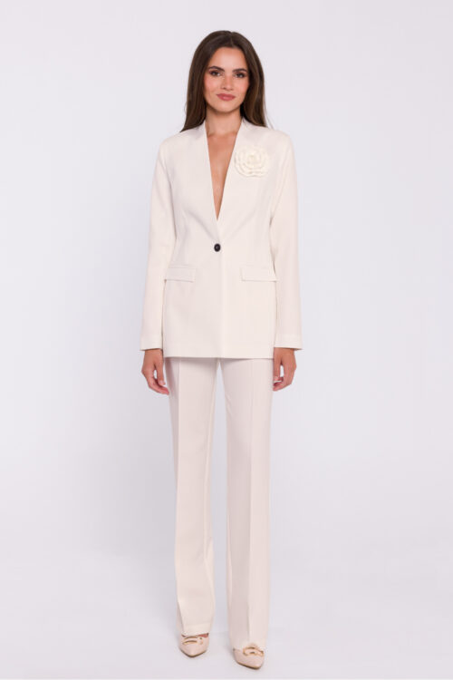 Elegant women’s woven jacket with a slim fit that emphasizes the silhouette. Collarless and fastened with a single button, which gives it a modern and minimalist character. There is a decorative, attached flower on the chest, which adds a unique…