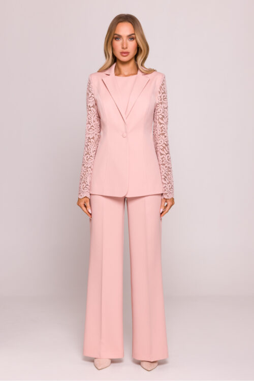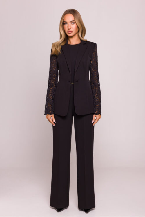 Stylish blazer that combines timeless form with modern detail. Made of smooth, high-quality fabric, it has been enriched with long sleeves made of elastic lace, which add lightness and feminine character to the whole. The classic collar with lapels and…