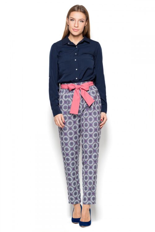 Women’s trousers with a decorative crease at the waist and a sash to tie. Slide pockets on the sides. Trousers with a zip. Polyester 100 % Size Hips width Waist width L 99-102 cm 74-77 cm M 96-98 cm 70-76…