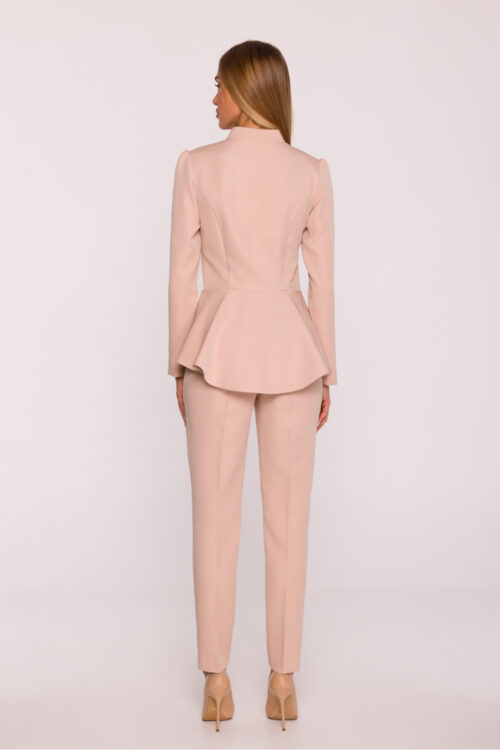 Elegant, classic jumpsuit made of smooth fabric with a soft finish. The top is fitted, decorated with a subtle ruffle, finished with a stand-up collar. The long, slightly puffy sleeves are finished with cuffs fastened with decorative buttons, adding a…