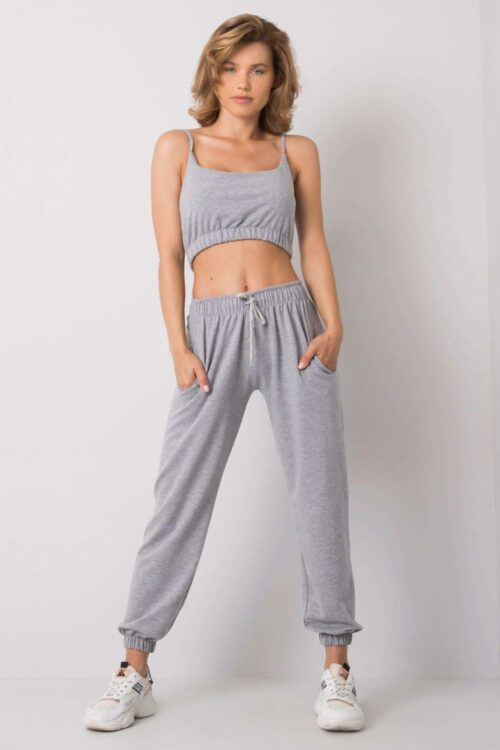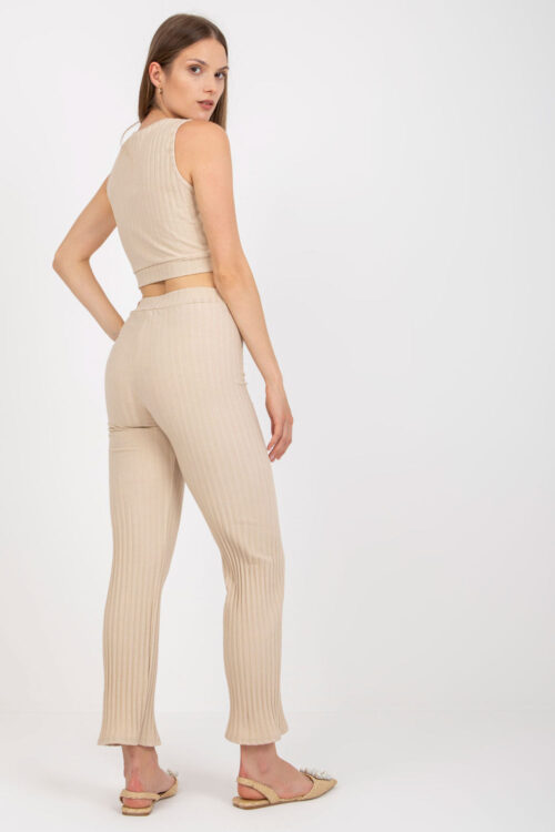A set consisting of a top and long pants. Short top with round neckline. Long pants with high waist and straight legs, with an elastic band at the waist. The whole is made of a wide ribbed fabric. Cotton 95…