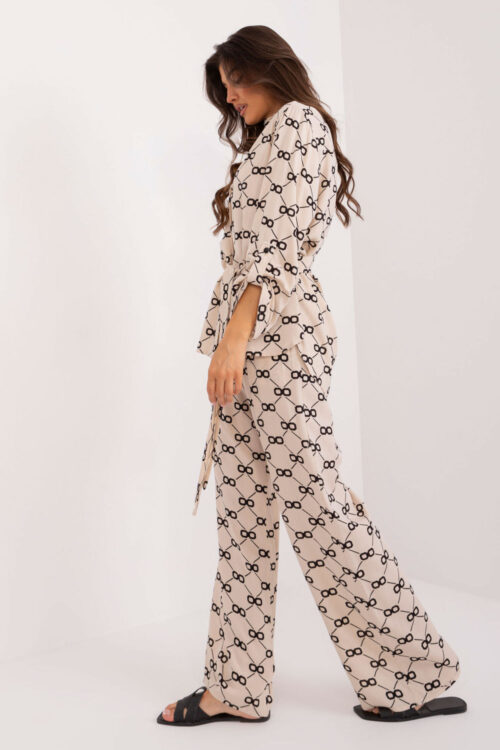 An ideal elegant set made of lightweight costume fabric with viscose, an extremely breathable and airy material. The set includes an elegant sleeveless boxy blouse with a small V-shaped cutout and high-waisted flared trousers (decorative stitching along the leg slims…