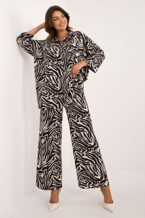 Women’s set with a fashionable animal motif, consisting of a shirt and pants, made of a combination of polyester and elastane. The shirt has long sleeves and is buttoned, giving it a classic character. Additionally, it is equipped with a…