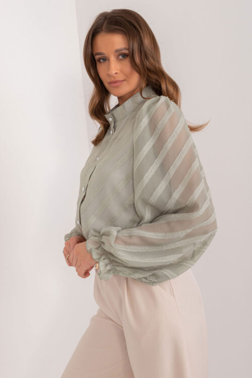 Casual women’s shirt with a unique, variegated fabric texture, made of organic cotton, ideal for everyday wear. The longer cut and buff sleeves give it a fashionable, slightly romantic character. The shirt has a classic collar and button closure, which…