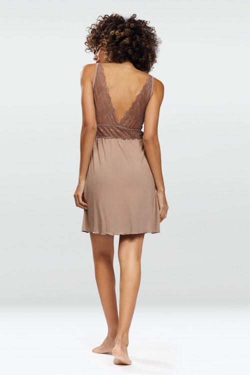 Fitted to the body, slightly translucent nightdress made of extremely interesting, pleasant to the touch elastic fabric with leopard pattern. In beautiful, warm colours. V neckline with lace trim, thighs also wrapped in beautiful lace. The chemise underlines body features…