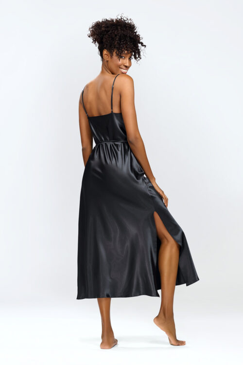 Nightgown made of elegant satin in classic black. Cut-off cups with a lace insert. Narrow, adjustable straps that cross at the back. On the back a sensual cut-out, decorated with lace. Spandex 1 % polyamide 6 % Polyester 93 %…