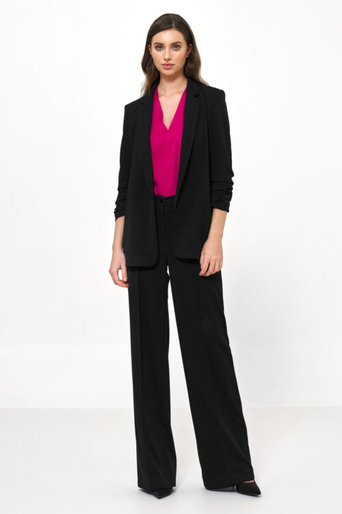 An elegant women’s material vest is a stylish wardrobe item that will work perfectly for everyday wear, work, and formal occasions. Its striped pattern adds a modern, slimming effect and makes the vest look great with both elegant trousers and a skirt. The model is made of high-quality blend of nylon, polyester, elastane, and viscose, making the vest comfortable, well-fitting, and maintaining its shape. The standard length ensures a classic, timeless look, and the sleeveless design gives it lightness and allows for creating many stylish combinations. The classic button fastening emphasizes the elegant character of the model, and the inner lining increases wearing comfort and indicates careful finishing. This vest will successfully complement both office and more formal stylings, adding elegance and character to them.