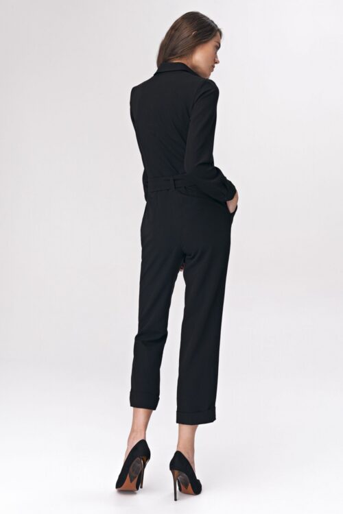 Even in trousers you can look extremely feminine. This unique suit combines the comfort of trousers and subtle elegance which you require from an evening dress. The back of the suit is slit and fastened with mini press studs. Slip-on pockets on the sides.