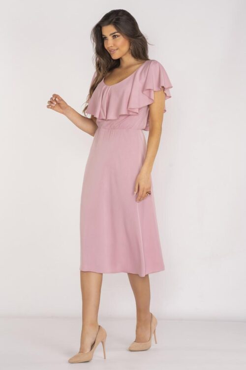 Extremely elegant and feminine midi length dress. The neckline is decorated with a ruffle, while covering the shoulders in a subtle way. It has a sewn-in elastic waistband and thus adapts to the figure. Fastened at the back with a…