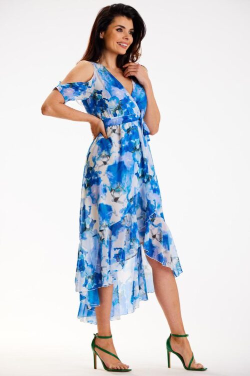 A maxi dress with an envelope neckline and an elastic waistband. It has ruffles at the shoulders and a belt to tie at the waist. It is the best choice for summer. You can wear it for a walk on…