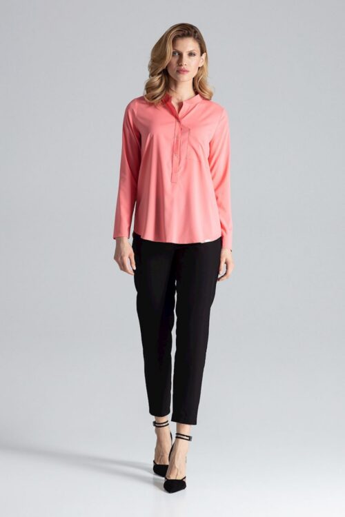 Classic long sleeve blouse with three snap fasteners. A semi-circular neckline finished with a stand-up collar. A patch pocket at the front, on the left side. Half-rounded, prolonged back. Spandex 5 % Polyester 95 % Size Total length Chest L…