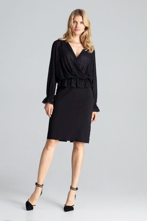Black brocade slightly transparent blouse with an envelope neckline, long sleeves. There is an elastic band at the waist and in the sleeves. Spandex 5 % Polyester 95 % Size Total length Chest L 63 cm 108 cm M 62.5…