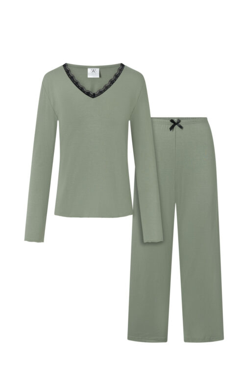 Two-piece pajama designed with elegance and comfort in mind. The V-neck, subtly finished with lace, adds feminine charm and lightness to it. The delicate color scheme and smooth fabric create a harmonious whole, perfect for rest and relaxation. The top…