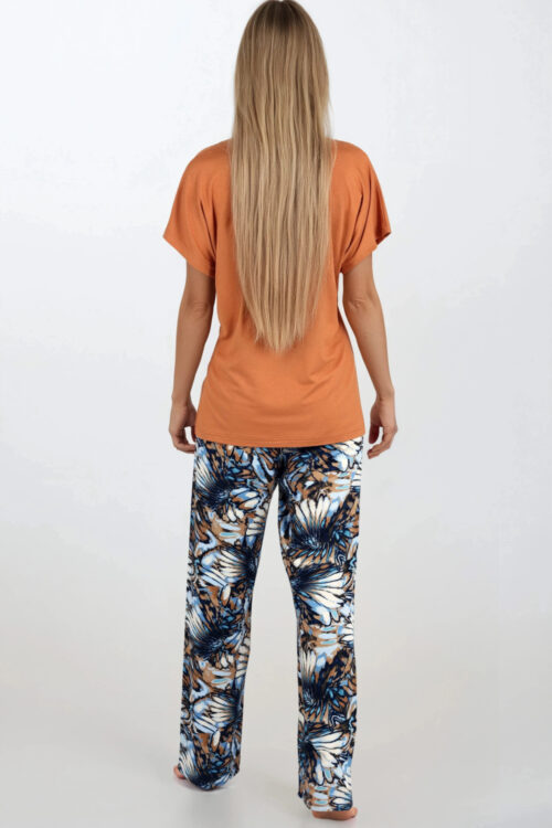 Comfortable women’s pajamas consisting of a blouse and pants. Blouse in solid color with short sleeves and a heart neckline. Long pants made of printed fabric with elastic waistband and decorative bow. Composition: Upper: 92% viscose, 8% lycra. Bottom: 100%…