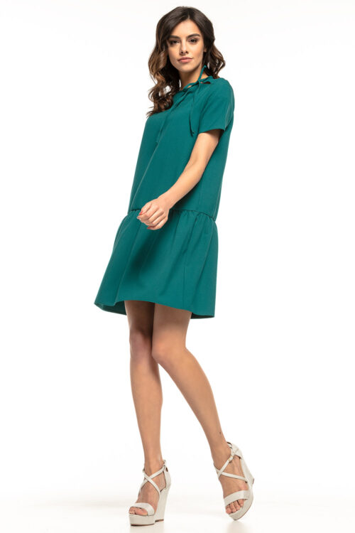 Elegant dress made of fabric with darts, which beautifully emphasizes our feminine shapes. The neckline of the dress is finished with a decorative trim for tying. The bottom of the dress is trapezoidal, which we think is a great alternative…