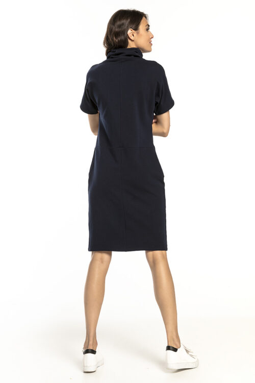 A fitted dress made of a pleasant-to-the-touch knit sweatshirt with a chimney, long sleeves, and pockets in the hip seam. The centre of the chimney is finished with a contrasting colour fabric. Welts at the sleeves and at the bottom…