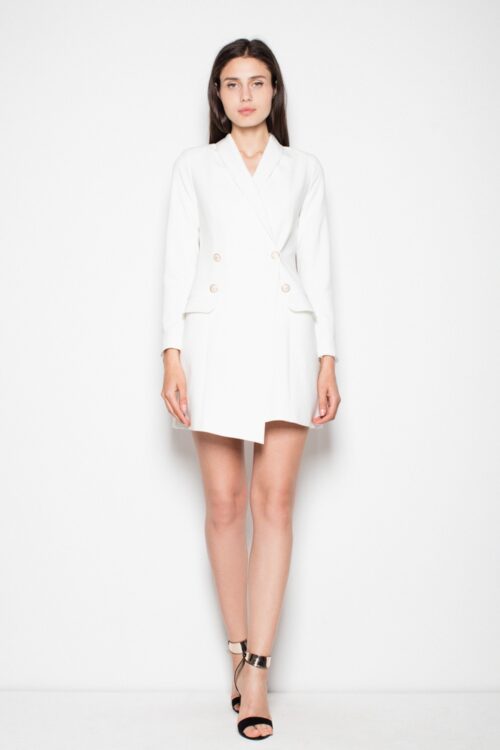 Elegant jacket dress fastened with decorative buttons that also appear at the sleeves. Dress available in classic colors. Can also be worn as a jacket. Spandex 4 % Polyester 66 % Viscose 30 % Size Lenght Hips Chest Waist L…