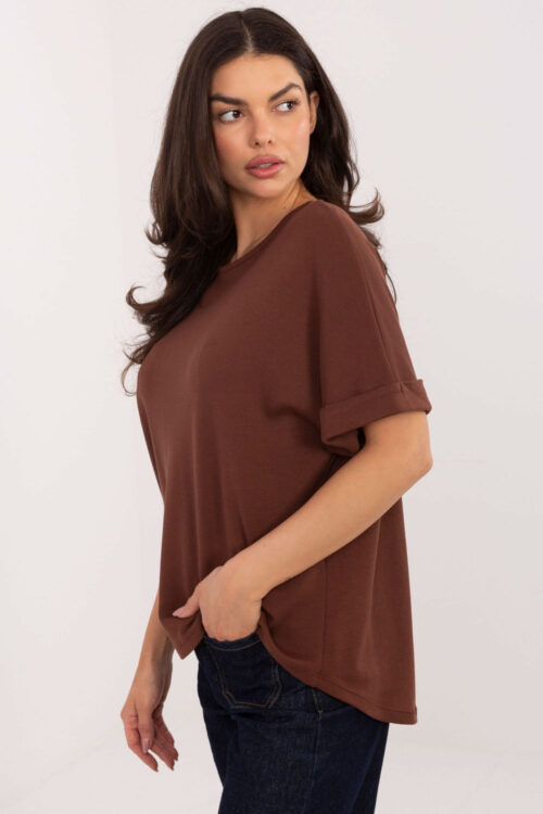 A simple blouse with short sleeves in brown. Perfect for everyday wear. Spandex 5 % Polyester 95 % Size Chest L 93-96 cm M 89-92 cm S 85-88 cm XL 97-100 cm