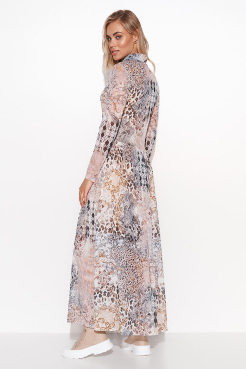 Chiffon midi dress with neckline and long sleeves. Dress made of fabric with a beige-blue pattern. Polish production. Numoco brand. Spandex 5 % Polyester 95 % Size Lenght Hips Chest Waist L 128 cm 100 cm 86 cm 64 cm…