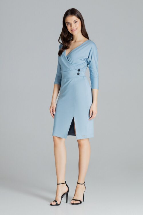 Blue fitted midi dress with kimono 3/4 sleeves, envelope neckline. A decorative belt with buttons at the waist. A covered zipper at the side. A delicate slit at the front on the left leg. Spandex 4 % Polyester 30 %…
