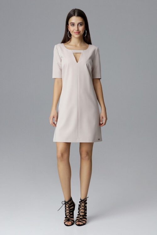 Slightly flared, 3/4 sleeve dress with a decorative clasp at the neckline. Trapezoidal cut is perfect for many figure types, Polyester 65 % Viscose 35 % Size Hips Chest Waist L 99-102 cm 93-96 cm 74-77 cm M 96-98 cm…