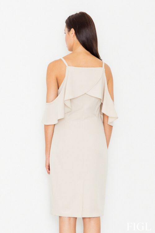 – chic dress – made of soft solid knitwear – extremely fashionable and feminine cut – model reveals shoulders – top decorated with frills – fits beautifully on the silhouette – model available in several beautiful colours
