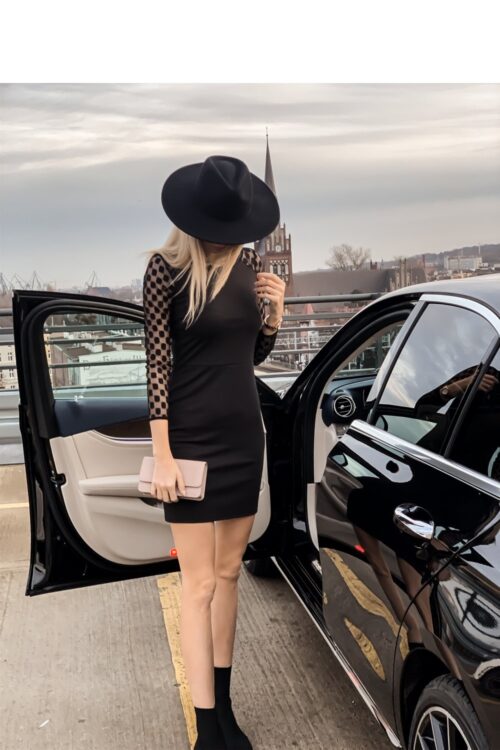 Elegant dress with a fitted cut. Dress is made of high quality knitwear and mesh with a pea pattern. Decorative stitching emphasizes feminine shapes. Long sleeves. Back of dress decorated with geometric neckline. Dress worn over the head. Dress designed…
