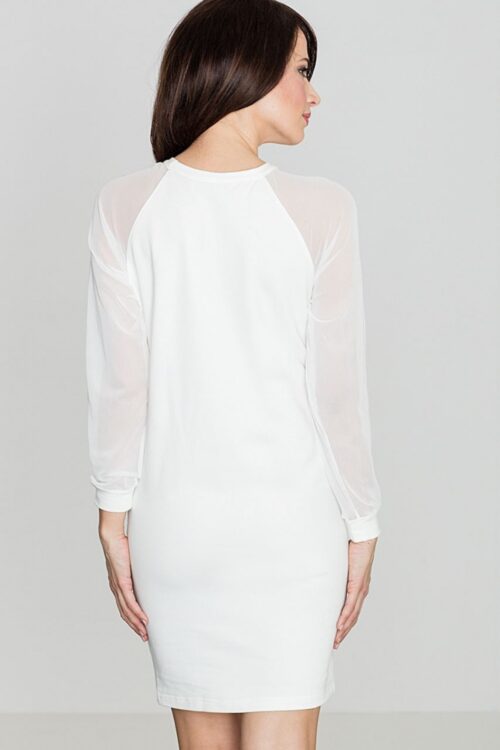 Sexy dress with a fitted cut. Transparent elements of sexy mesh subtly expose the body. A low neckline adds elegance to the dress. Long sleeve combined with fabric and mesh. Interesting geometric cuts and decorative silver zipper on the back…