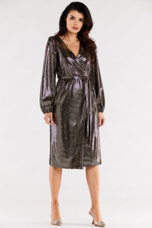 Sequined envelope dress with wider sleeves and a ruffle at the cuff. Wide elastic at the waist for a snug fit. The dress is sewn with elastic lining. The dress is made in Poland. Spandex 5 % Polyester 95 %…
