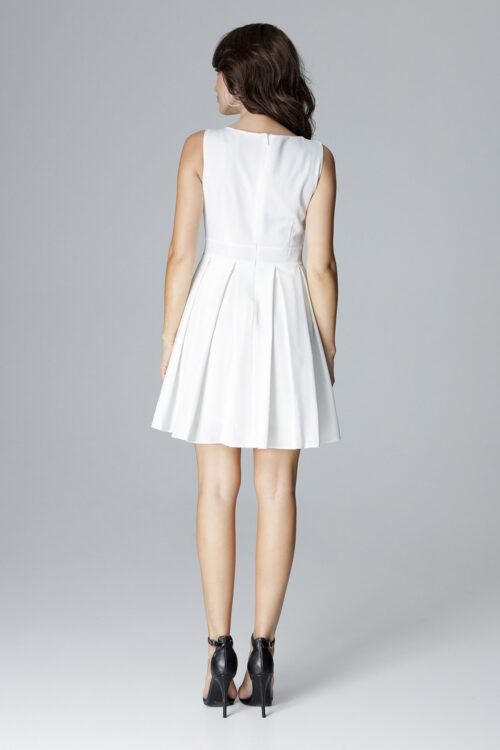 Sleeveless dress. With a fitted top and feminine, low neckline. Model cut at the waist with a flared, arranged in wide folds bottom. Dress perfectly emphasizes and slims the waist. Polyester 65 % Viscose 35 % Size Hips Chest Waist…