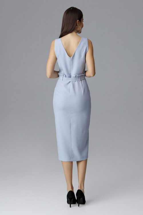 Elegant midi dress with asymmetrical basque and short sleeves – cornflower blue. Dress optically slims waist and hides the imperfections around the hips. Numoco brand. Polish product. Spandex 5 % Polyester 95 % Size Hips Chest Waist L 98 cm…