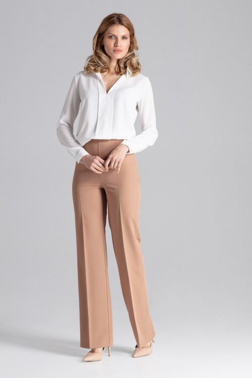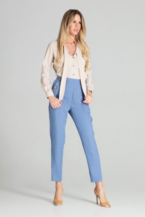 Women’s pants with straight legs, button and zipper closure. High-waisted pants with slip pockets on the sides. Polyester 65 % Viscose 35 % Size Hips width Waist width 34 86 cm 66-74 cm 36 90 cm 72-80 cm 38 94…