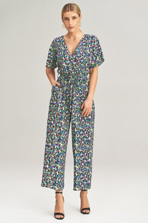 Stylish and elegant women’s jumpsuit that combines comfort with a feminine silhouette. The top in a wrap style with subtle pleats beautifully drapes on the silhouette, and the V-neck adds lightness and highlights the neckline. Short sleeves provide comfort and…