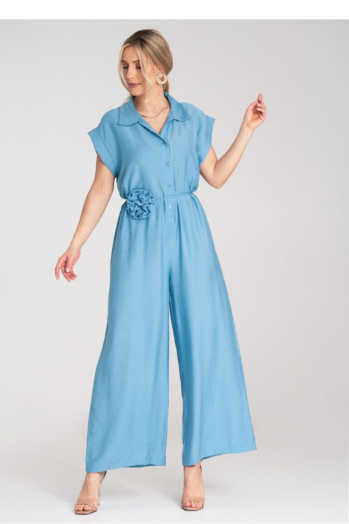 Jumpsuit with a collar and button fastening, with slightly elongated shoulder line ending with short tabs. A thin belt with a decorative flower made of the same material at the waist. Wide and long legs, loosely falling. Spandex 9 %…