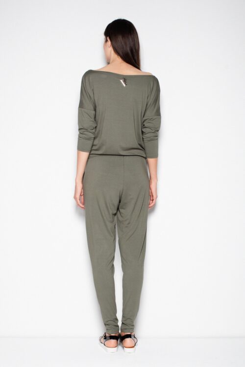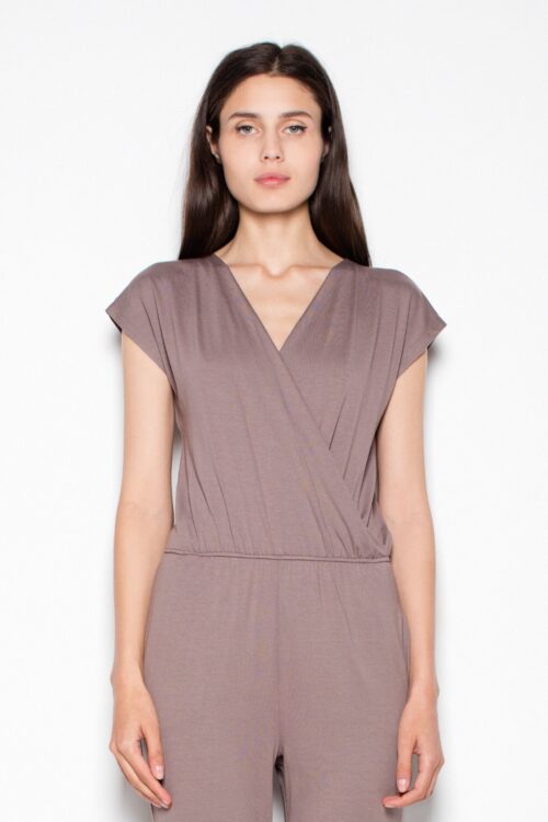 Fashionable and extremely feminine jumpsuit made of soft viscose with elastane. The bottom is a long trousers with pockets. The legs are tapered, with an elastic band at the waist and a playful tie. The top is a looser blouse…